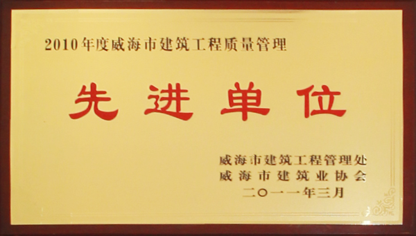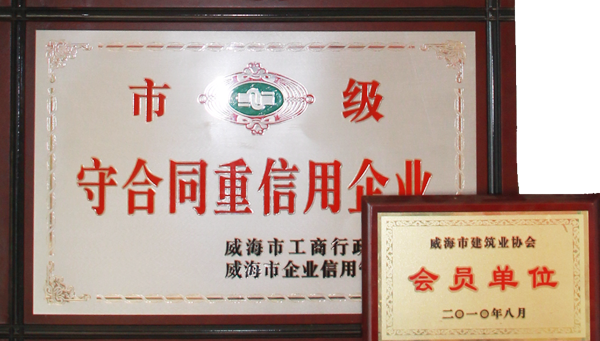 公司連續(xù)八年榮獲威海市“誠(chéng)信開(kāi)發(fā)企業(yè)”、“建筑施工誠(chéng)信企業(yè)”,連續(xù)九年被評(píng)為威海市級(jí)“守合同重信用企業(yè)”,多次被評(píng)為威海市“市級(jí)文明單位”、“質(zhì)量管理先進(jìn)企業(yè)”、 “安全管理先進(jìn)企業(yè)”,乳山市“優(yōu)秀企業(yè)”、“先進(jìn)民營(yíng)企業(yè)”、“納稅明星企業(yè)”,在社會(huì)上逐步樹(shù)立了誠(chéng)信、穩(wěn)健的企業(yè)形象。